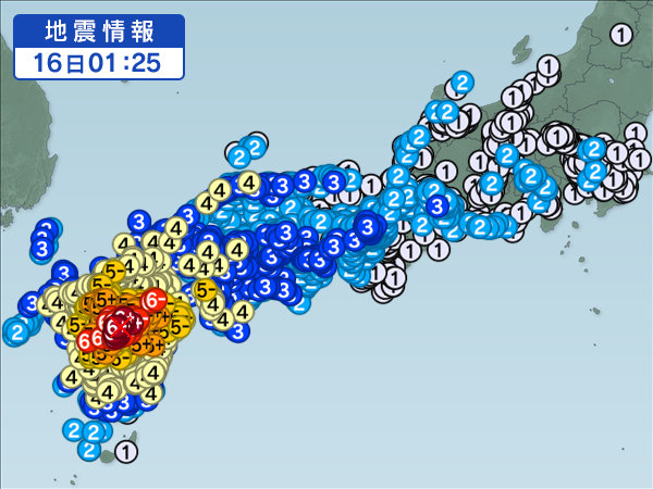 | 2016年4月16日 3時55分ごろ | 熊本県阿蘇地方 | 5.8 | 6強 |
